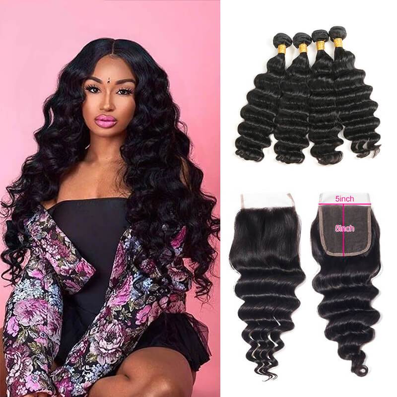 Wavymy Loose Deep Wave Natural Color Human Hair Weave 4 Bundles with 5x5 Lace Closure