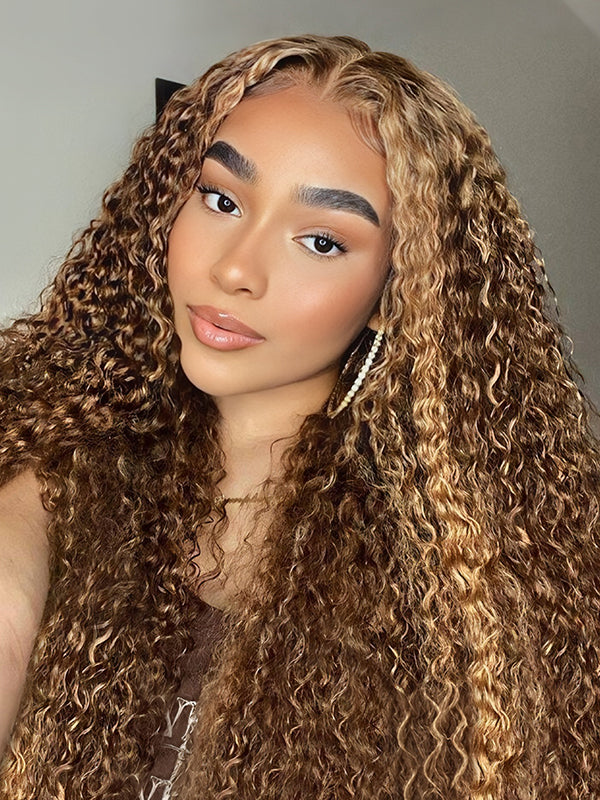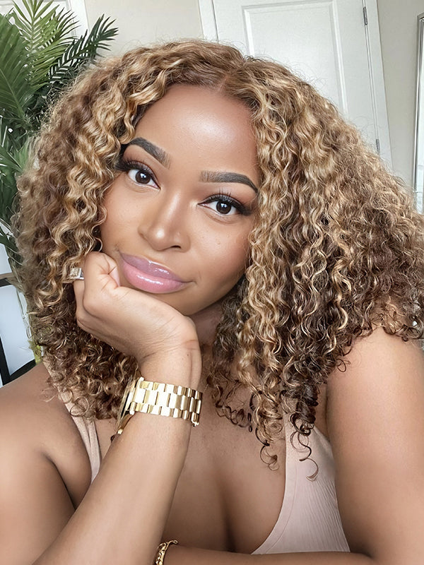 Wavymy Honey Blonde Highlight Water Wave Pre-cut 4x4 Lace Wear Go Glueless Bob Wig 180% Density